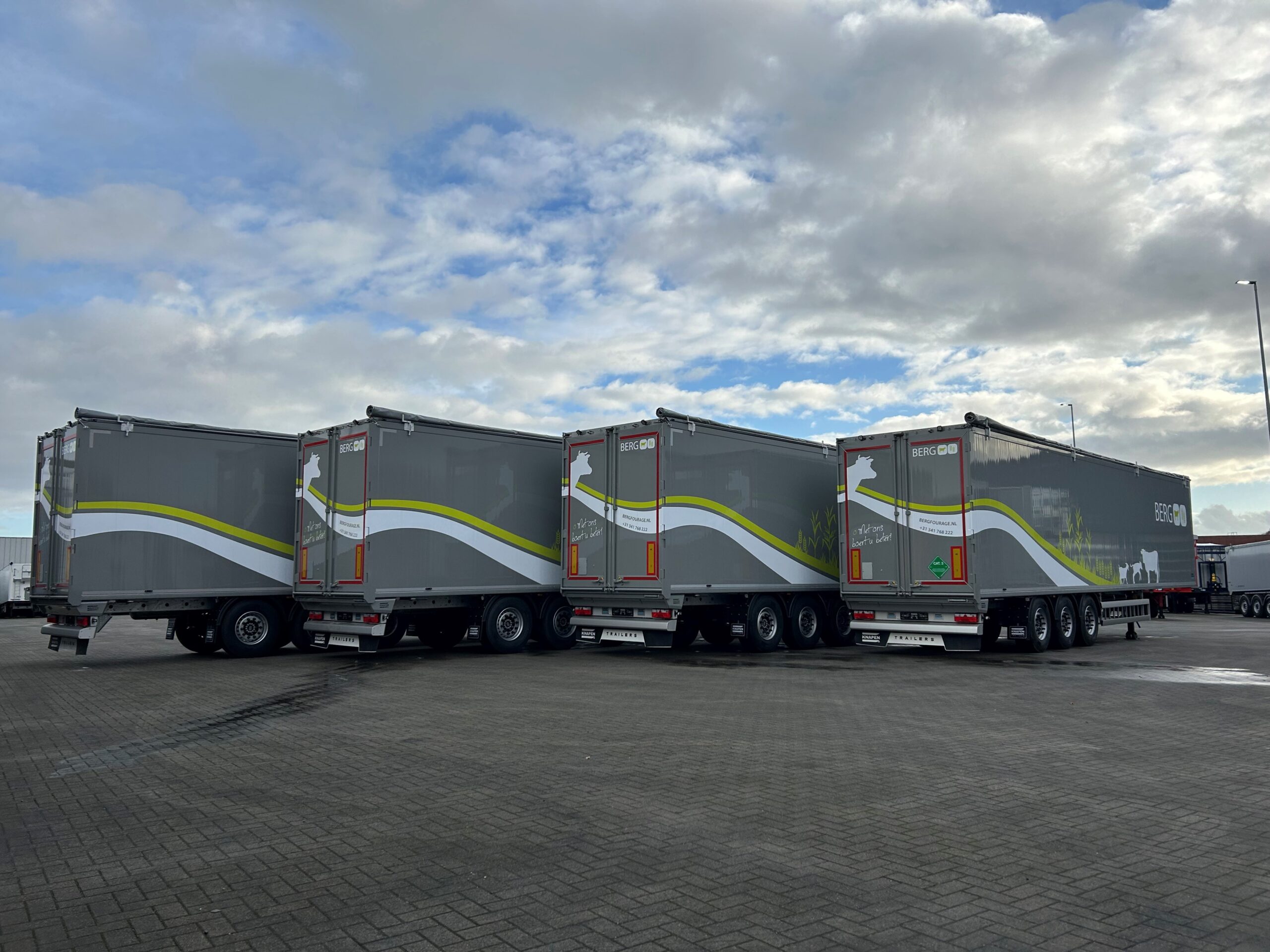 Wir durften Berg Fourage mit diesem Quartett neuer, praktischer Knapen Schubbodenauflieger ausstatten. Diese Trailer werden für die Lieferung von Stalleinstreu, Raufutter, Nebenprodukten und Rohstoffen an Viehhalter in den gesamten Niederlanden und Westdeutschland eingesetzt.